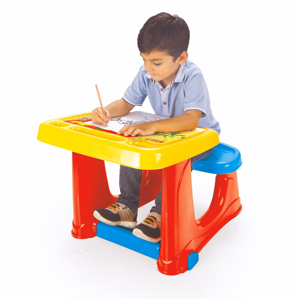 Стол отлично смывает следы фломастеров, пластилина, красок и другие следы после творчества ребенка. Так же продуман наклон стола для того чтобы ребенок ровно сидел и не горбился. Стульчик широкий, поэтому у ребенка не будут передавливаться ножки. Под столешницей расположена балка цилиндрической формы, благодаря которой ребенок будет упираться ножками и не портить спину при сидении.