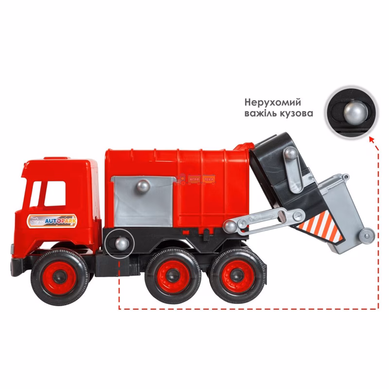 Игрушка оснащена автономным контейнером для мусора. Контейнер передвигается на колесиках.
