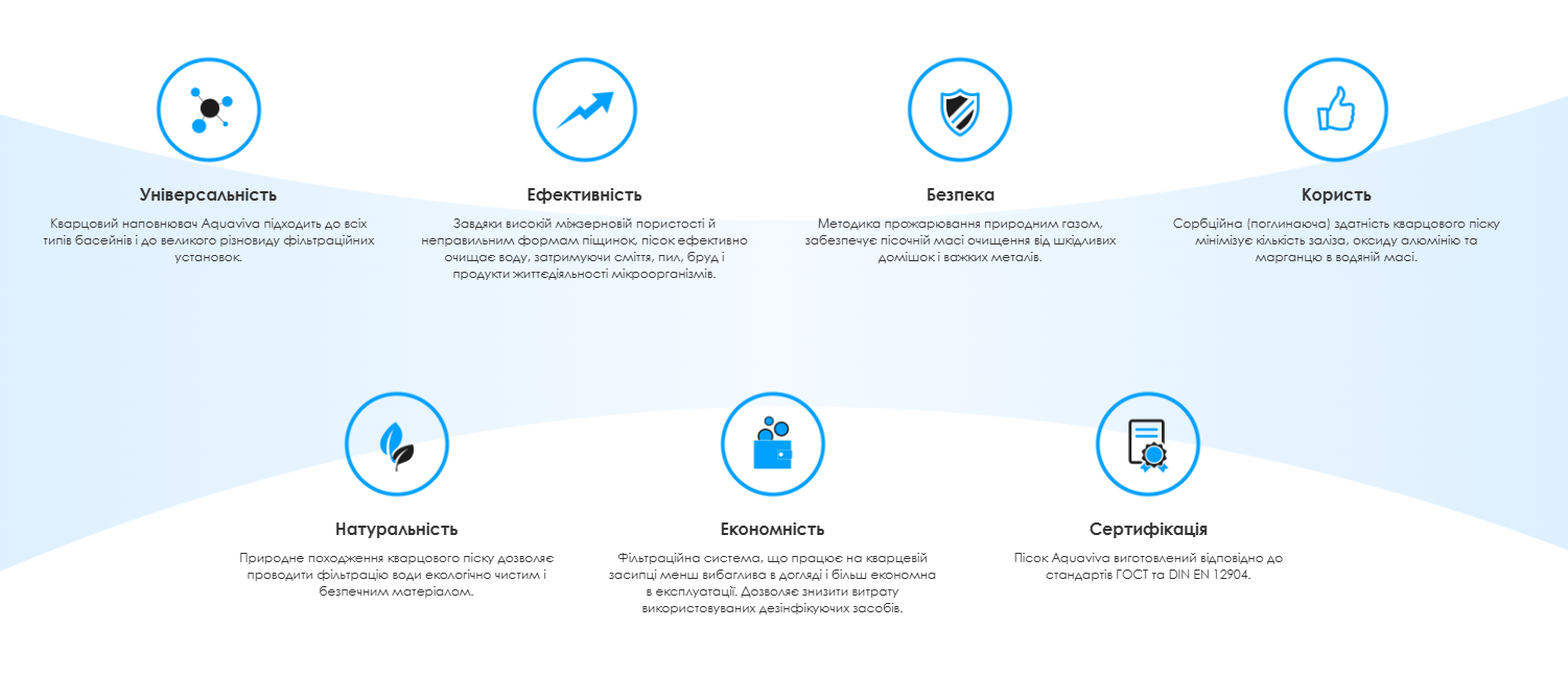 Чітка фракція (0.8–1.2 мм): Процес ретельного знепилювання та калібрування гарантує, що залишки під ситами не перевищують 2-3%. Це запобігає засміченню системи та вимиванню піску в басейн.