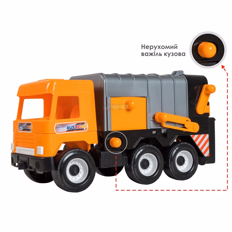 Вашему ребенку будет интересно с мусоровозом в песочнице, он сможет возить в нем песок. К мусоровозу входит также один мусорный бак.