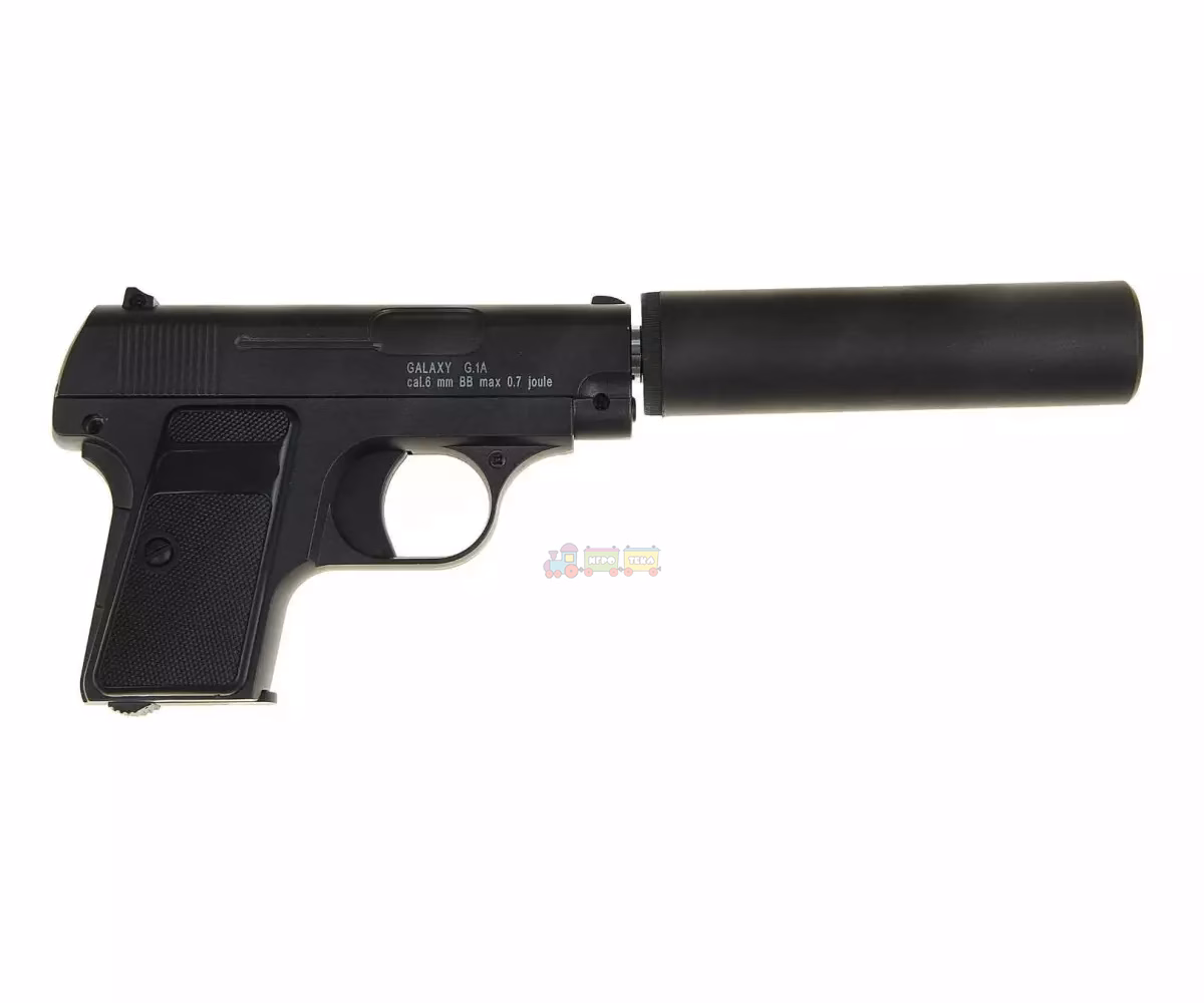 Galaxy G.1A — це пружинна страйкбольна модель, виконана у стилі легендарного пістолета Colt 25 зразка 1908 року. Іграшка вирізняється високою деталізацією та реалістичним зовнішнім виглядом завдяки металевому корпусу та декоративному глушнику, який входить до комплекту.