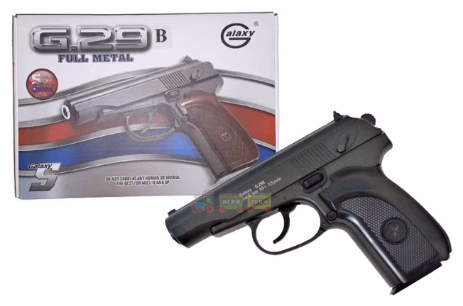 Страйкбольний пістолет Galaxy G.29B — це пружинна репліка легендарного пістолета Макарова, виконана з високою деталізацією та наближена за зовнішнім виглядом і габаритами до бойового оригіналу. Модель призначена для стрільби пластиковими кульками та підходить для розважальної стрільби на короткі дистанції.