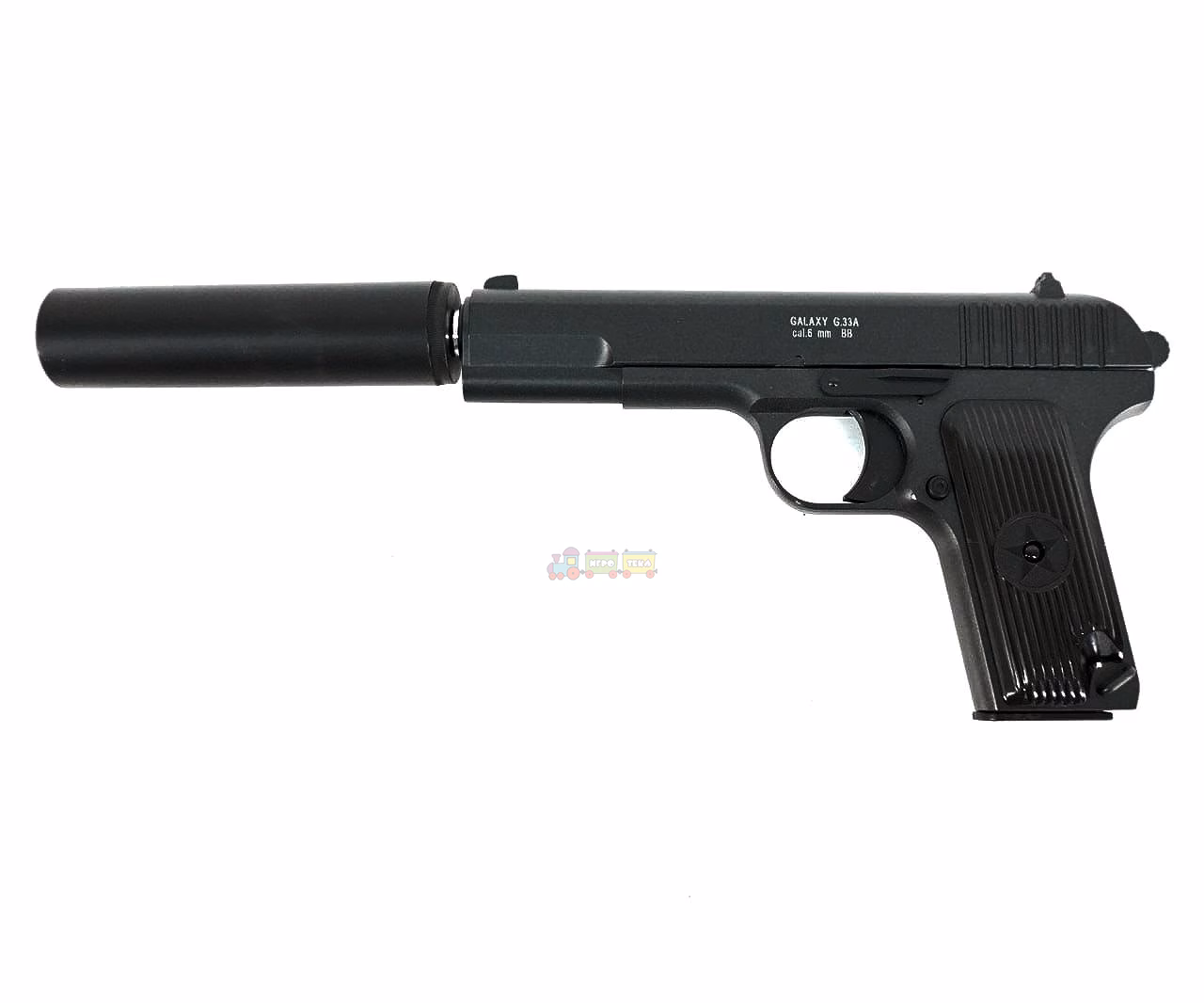 Пістолет Galaxy G.33A (AG33A) — це пружинний страйкбольний пістолет, виконаний у вигляді повнорозмірної копії легендарного пістолета ТТ (Тульський Токарєв). Модель поєднує реалістичний зовнішній вигляд, надійну конструкцію та простоту використання, що робить її чудовим вибором для дітей, підлітків та початківців у страйкболі.