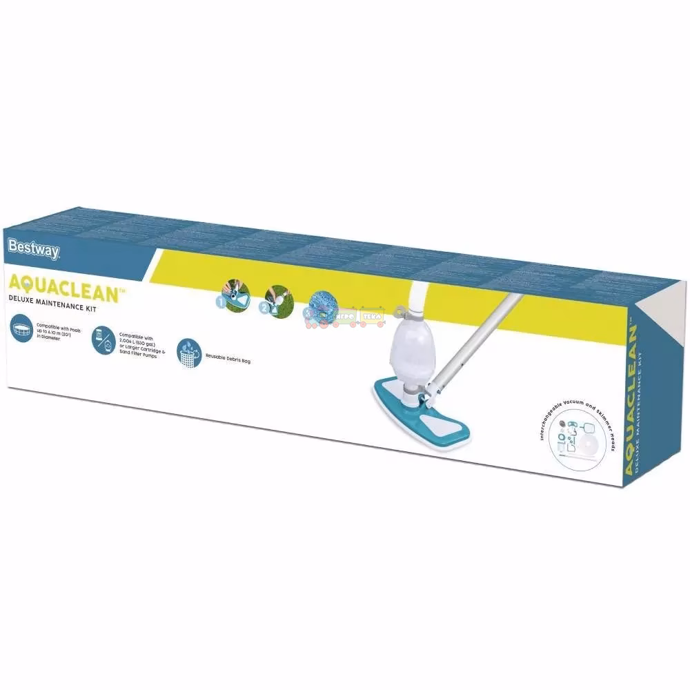Комплект для прибирання Delux 58237 Виготовлений із зносостійкого пластика. включає в себе алюмінієву штангу 279 см завдовжки, що дозволяє очищати воду від механічних забруднень навіть у басейнах великого розміру.